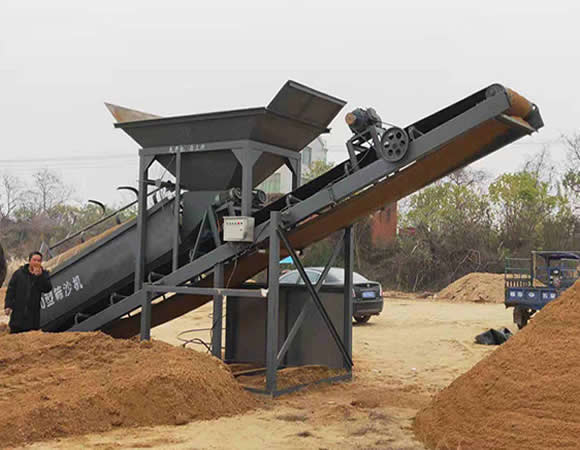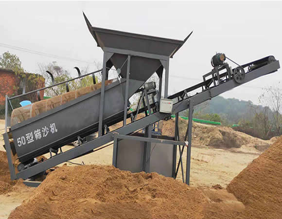 滾筒篩沙機(jī)是仿照人工利用斜面篩網(wǎng)篩砂的工作原理,采用平置滾篩筒,并保證料流在篩筒中的多圈內(nèi)螺旋葉片間可連續(xù)滾篩五圈以上,從而使砂料反復(fù)翻滾、滑動(dòng)而充分離散、分離;滾筒式篩沙機(jī)不同于斜置滾篩引起的大小料相互推擠、埋壓,篩分過(guò)程匆忙;也不同于斜置滾篩或斜置振動(dòng)篩所引起的大小料相互沖擠或大料托小料振跳而引起的篩分不干凈、混料現(xiàn)象。滾筒篩內(nèi)的打砂裝置,可對(duì)呈團(tuán)砂塊打碎、打散。滾篩網(wǎng)面安裝的網(wǎng)面清理裝置可對(duì)粘附砂土自行清理以防堵塞網(wǎng)孔。