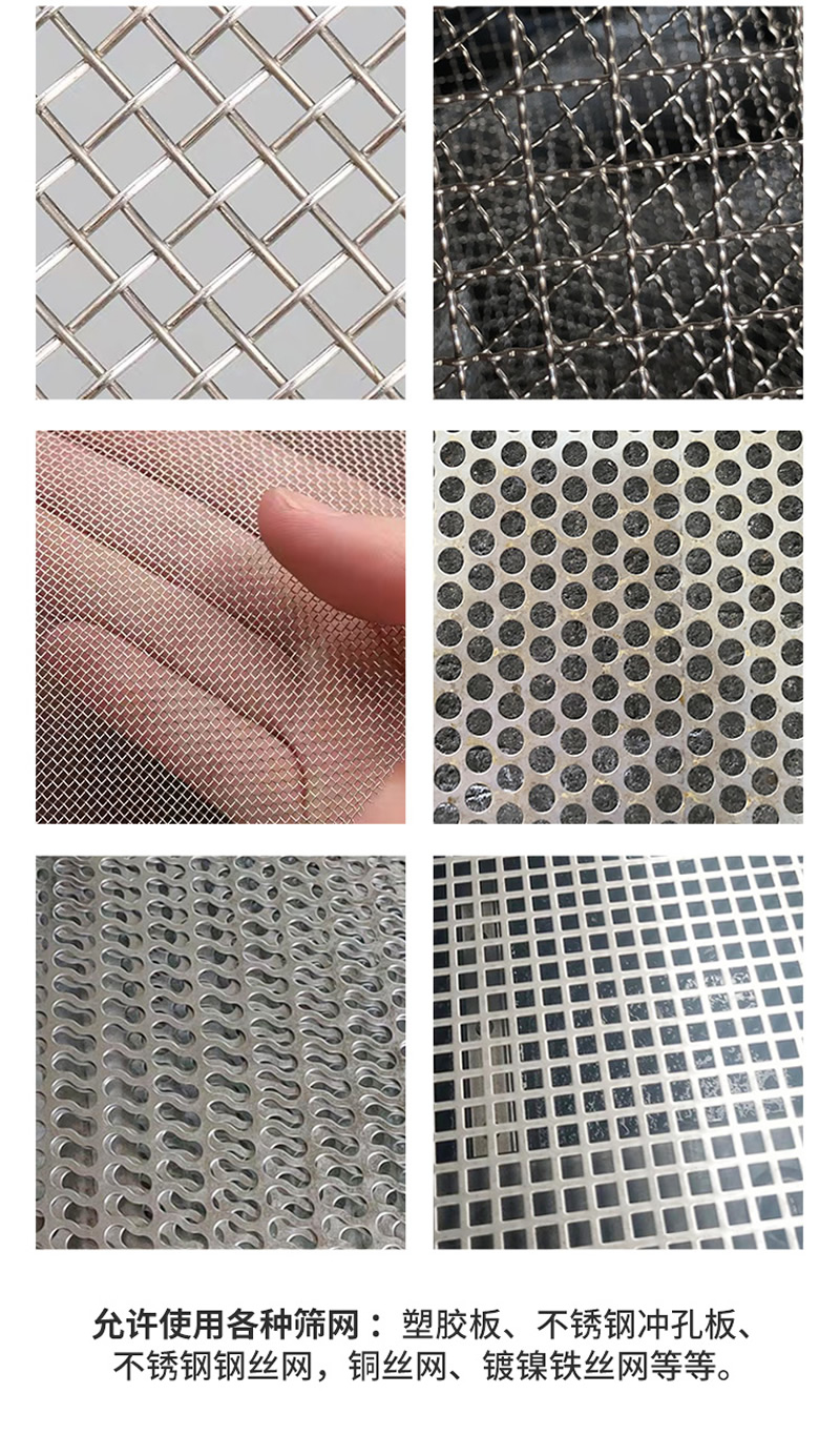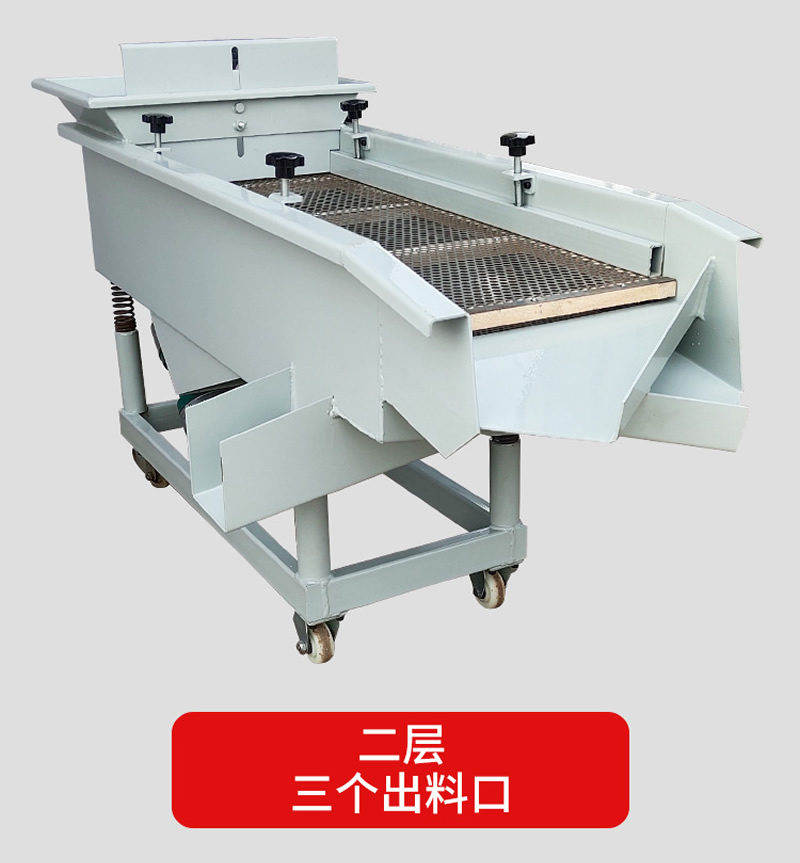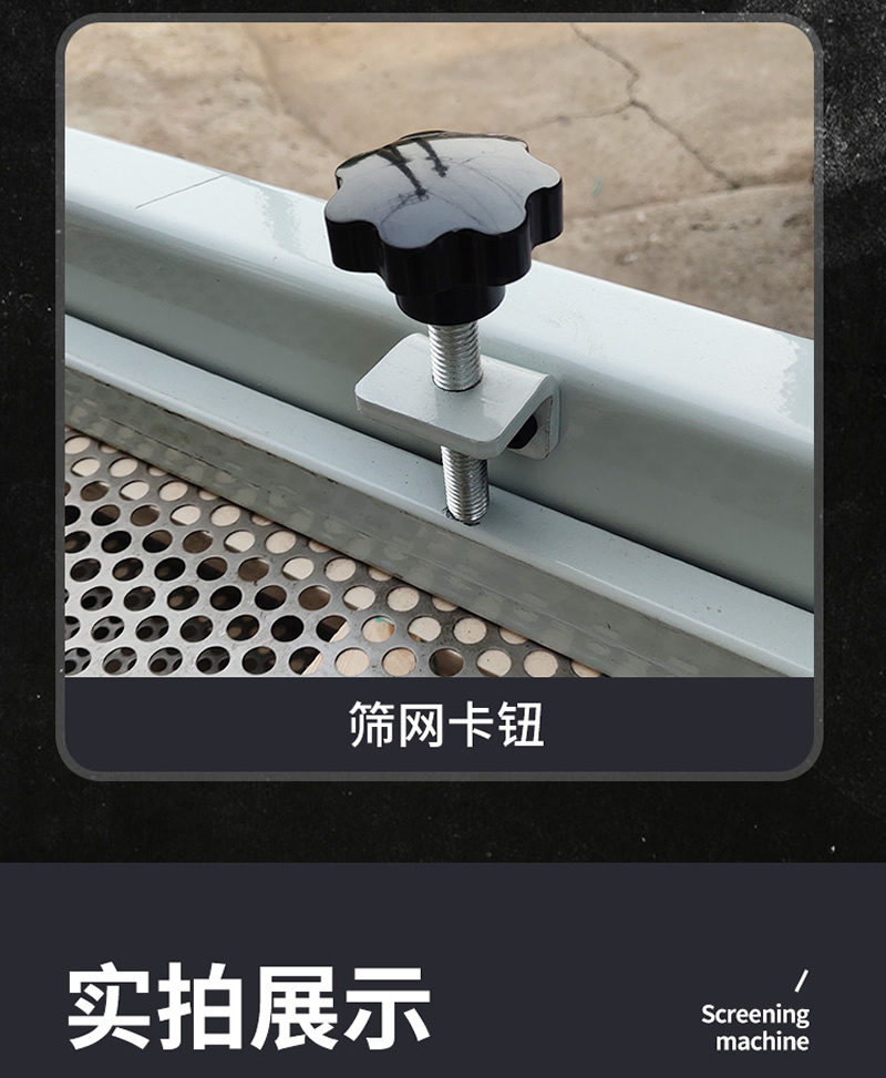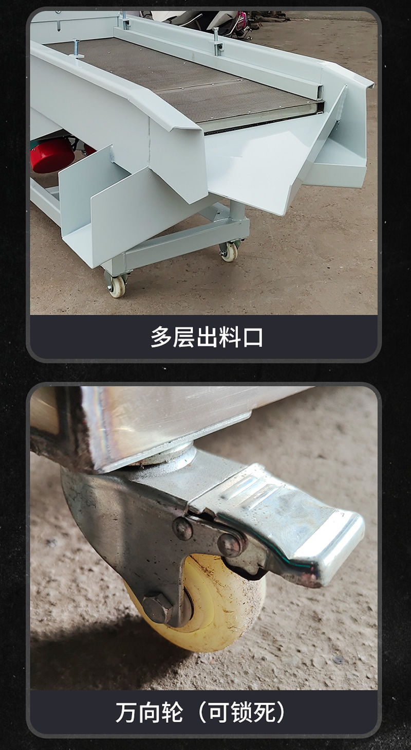 2、振動篩選機可選用220V-2.2kw或380V-1.5kw電機做動力源,集風選和篩分為一體,能干凈徹底地清除糧食或油料種子里面的各種雜質(zhì)和塵土,振動分選機由料斗、機架、傳動機構(gòu)、風機、風道等五部分組成,機架地腳裝有四個輪子,方便移動;篩網(wǎng)與機架采用分體式結(jié)構(gòu),便于更換各種不同目數(shù)的網(wǎng)篩。
