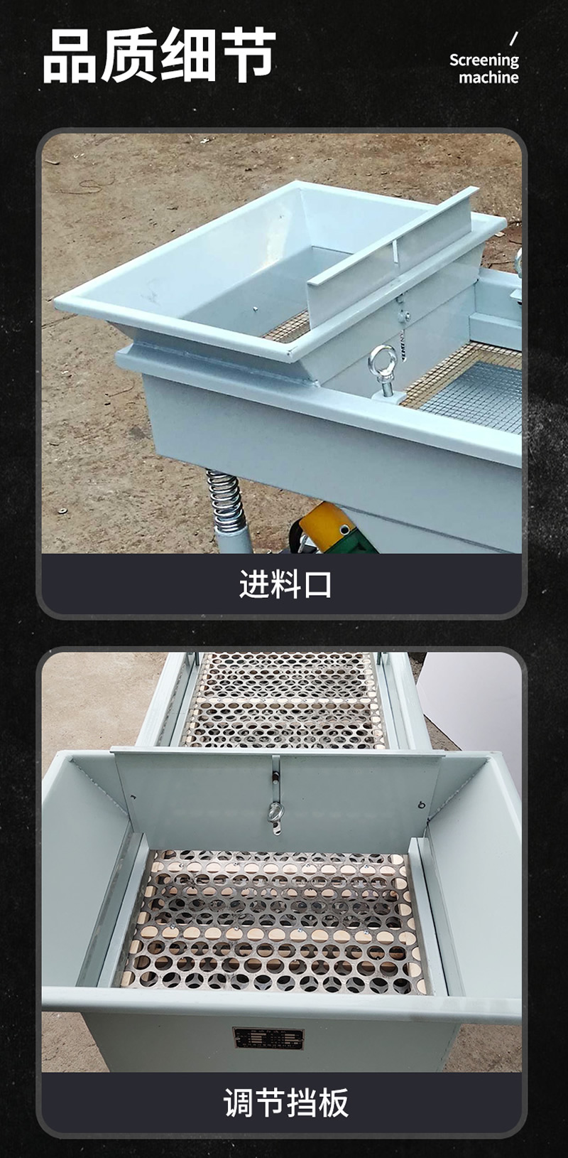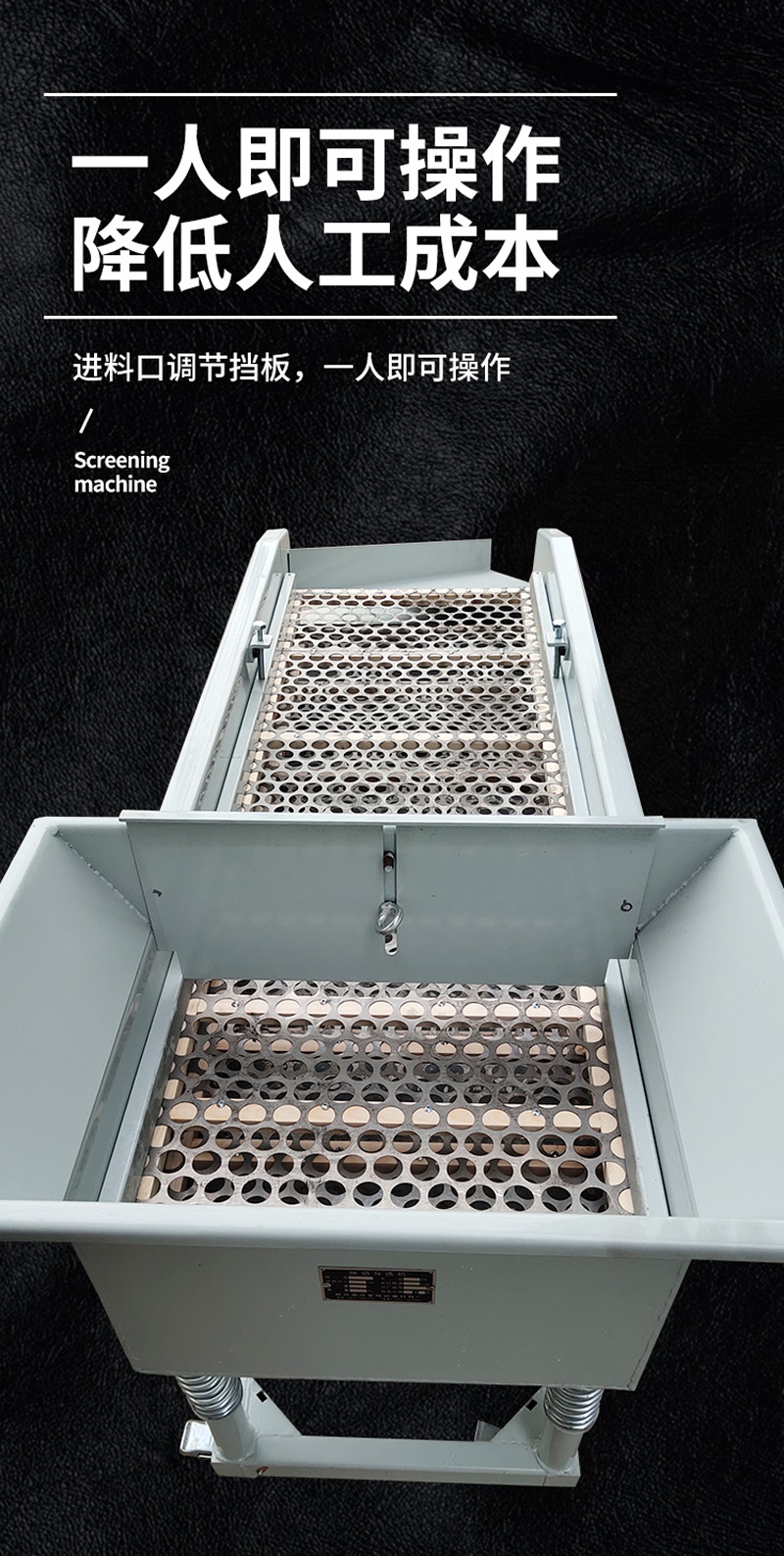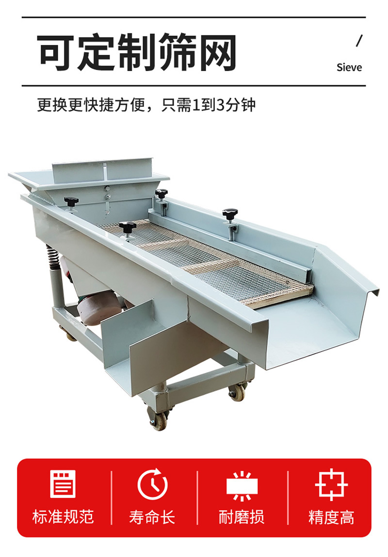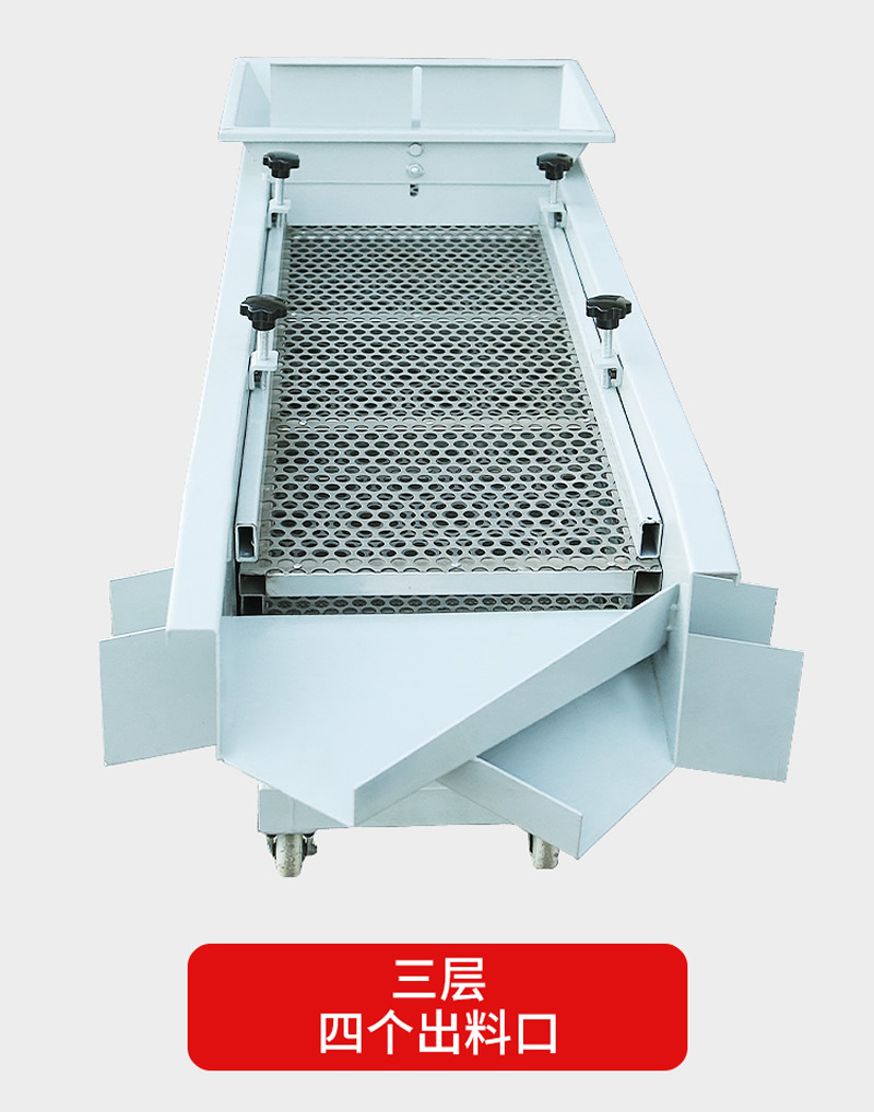 2、振動篩選機可選用220V-2.2kw或380V-1.5kw電機做動力源,集風選和篩分為一體,能干凈徹底地清除糧食或油料種子里面的各種雜質(zhì)和塵土,振動分選機由料斗、機架、傳動機構(gòu)、風機、風道等五部分組成,機架地腳裝有四個輪子,方便移動;篩網(wǎng)與機架采用分體式結(jié)構(gòu),便于更換各種不同目數(shù)的網(wǎng)篩。