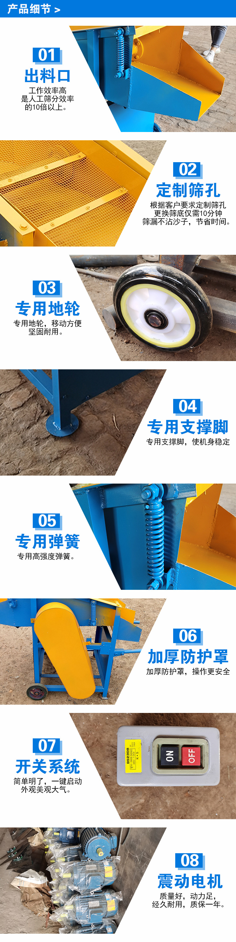 2、電動篩土機(jī)在運(yùn)行時不準(zhǔn)檢修、注油、調(diào)整、觸摸。設(shè)備檢修或清理時應(yīng)關(guān)閉(切斷)所有總、分電源,并掛攀上禁止合閘,有人工作 - 示 - 。鏟車裝卸砂時,不準(zhǔn)撞擊土壤篩土機(jī),放料時應(yīng)緩慢均勻給料,不準(zhǔn)猛砸,以免設(shè)備發(fā)生變形影響使用。雨天應(yīng)停止工作,對電機(jī)、閘箱應(yīng)做防水處理,以免造成安全事故.