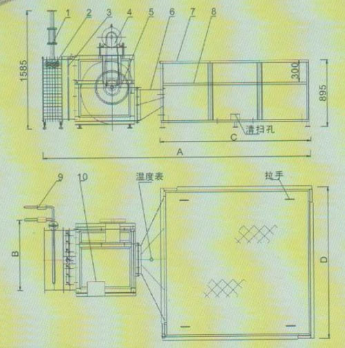 | 型號 | 風量(m3/h) | 功率(Kw) | 蒸汽耗量(kg/h) | 散熱器面積(m2) | 干燥能力(KgH2O/h) | 外形尺寸(長寬高)MM |
